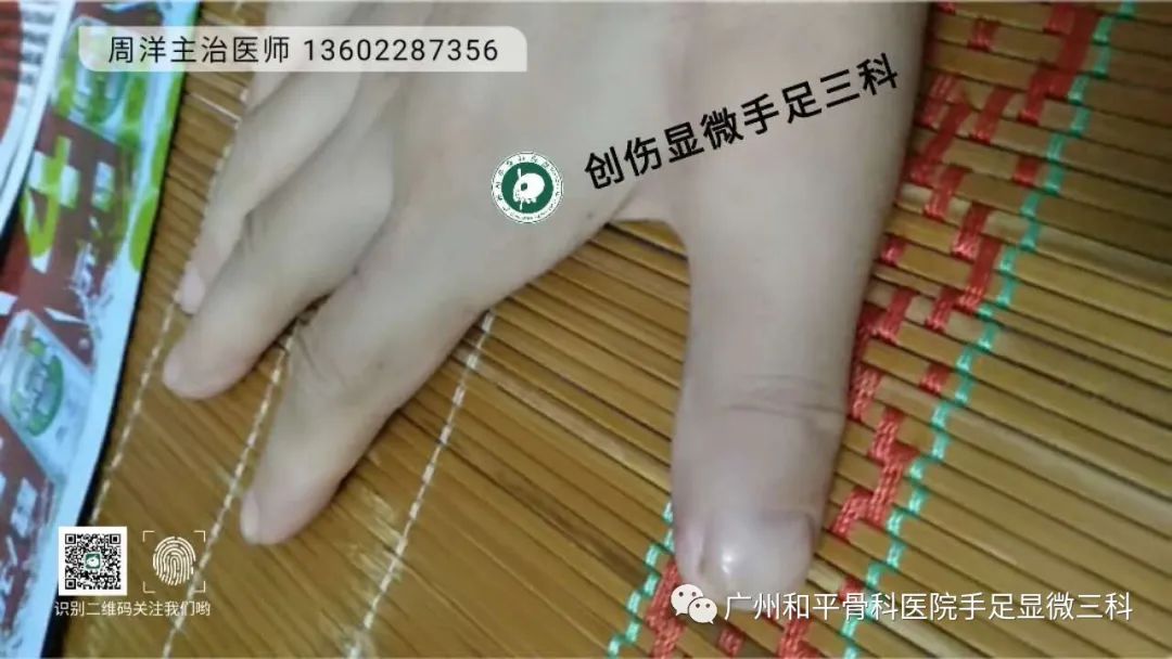 患者女性,外伤术后右拇指指腹缺损、瘢痕挛缩,甲壁甲床畸形,游离部分踇甲瓣微创显微再造右拇指指尖,术后康复良好,再造拇指外形、功能效果好。
