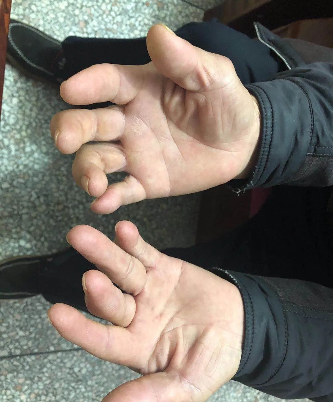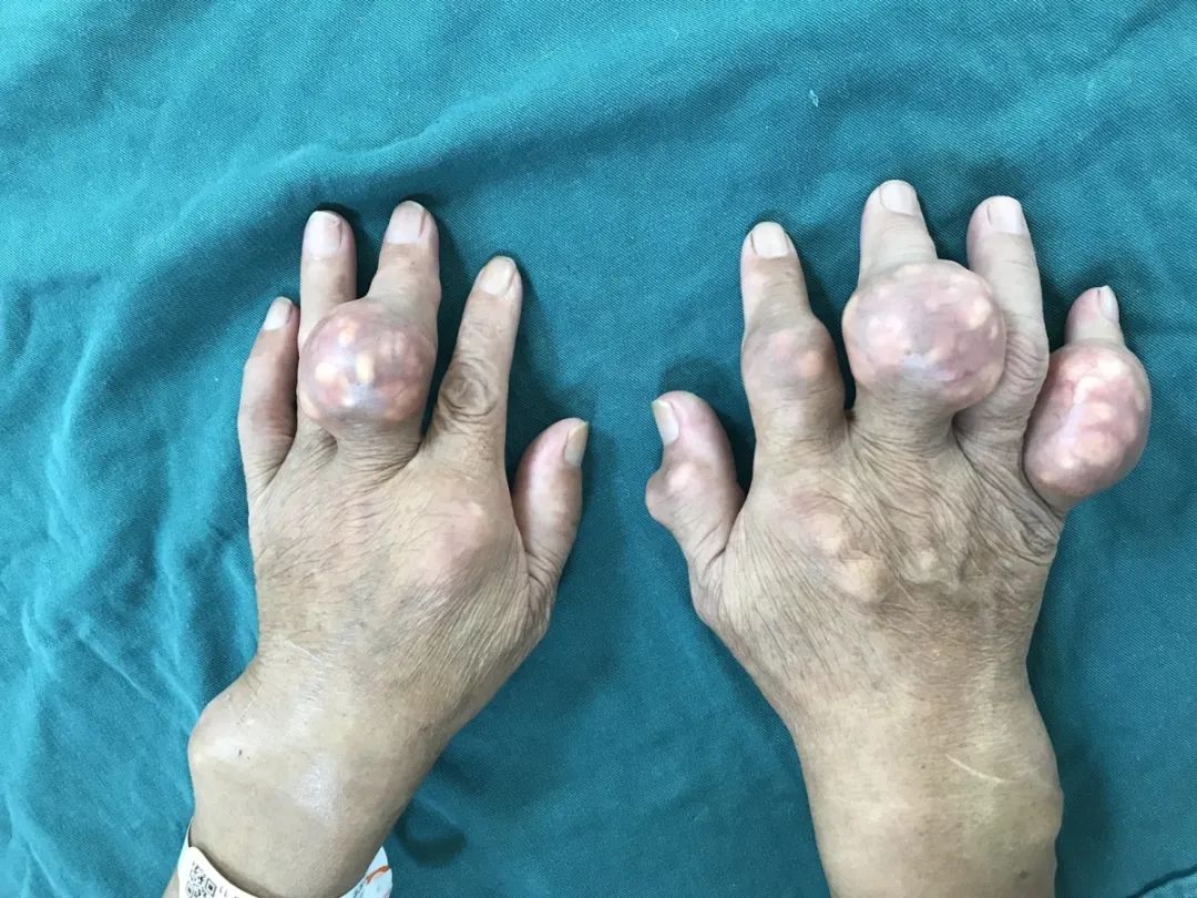 在创伤显微手足三科古欣庆主任的诊断下,发现其双手及双足多处巨大的痛风石,全身大大小小的痛风石数不胜数,突起于皮肤。痛风石宛如鸡蛋蛋黄大小,手足痛风石畸形严重,异常疼痛,甚至影响专科体格检查。当老伯听到可以诊治时,患者及家属都激动不已,仿佛寻找到救命稻草。