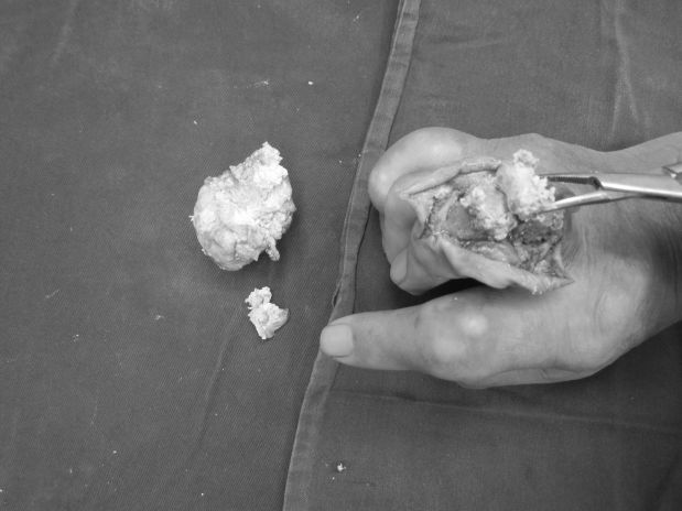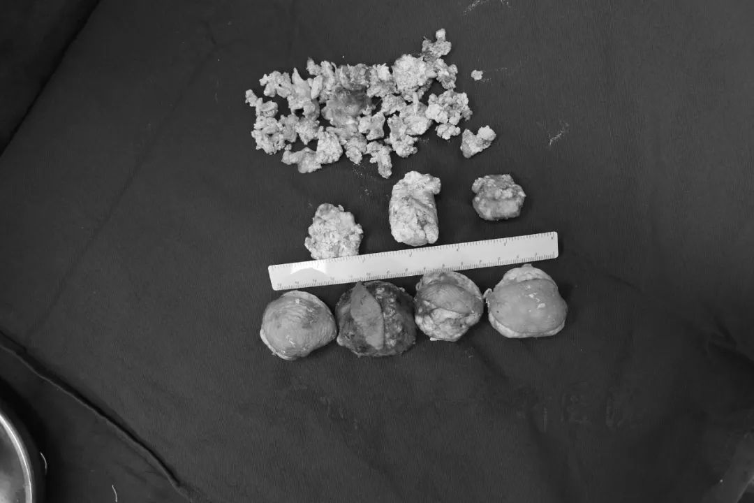 考虑到老伯还患有其他疾病,古主任的手足三科医护团队与麻醉科团队通力合作下,经过4小时的努力,把老伯的双手及前臂痛风石顺利取出,取出来的完整结石多达7块,最大直径约5cm,术后老伯肢体血运良好,接下来只需要控制及维持尿酸到正常水平即可逐渐康复。