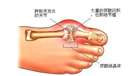 若痛风石向关节腔内发展,久而久之,关节及骨将被广泛破坏而发生畸形,明显影响关节功能。若痛风石不断增大,覆盖在痛风石上的皮肤就不断绷紧而变得发亮、菲薄,一旦有外力摩擦,便容易发生溃烂。痛风石与软骨摩擦导致脚趾、手指等骨关节发热、红肿、胀痛、变形,若不及时治疗,就会造成骨关节畸形。