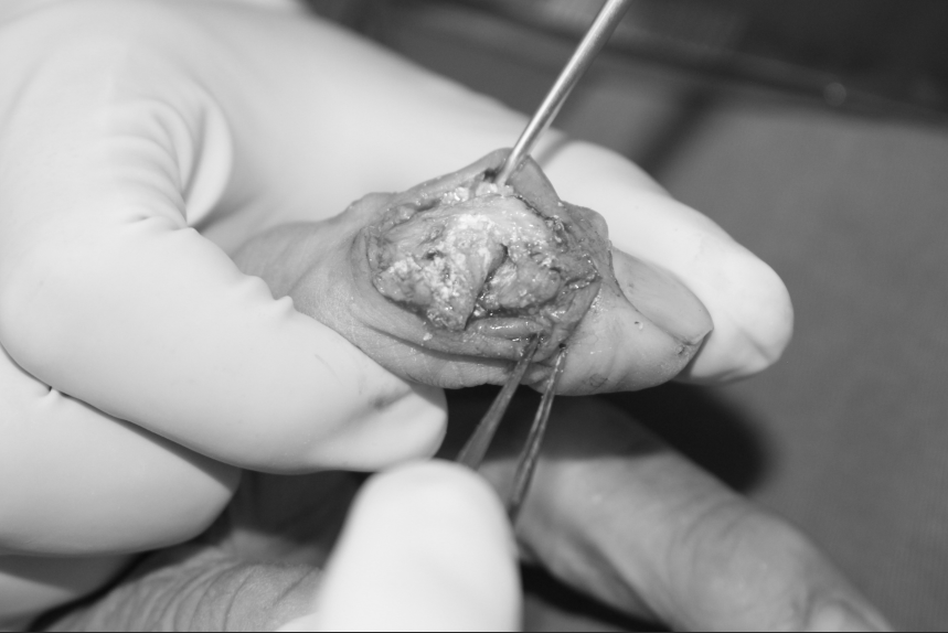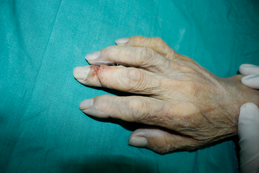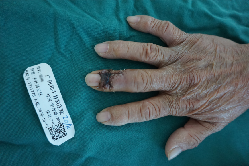 创伤显微手外科三区周洋等医生团队给张伯进行了痛风石切除手术,术中把患者的右中指切开,把痛风石切除,还进行了远指间关节融合和克氏针内固定(2枚),局部皮瓣修复。手术很顺利,术后肢体血运良好,接下来只需要控制及维持尿酸到正常水平即可逐渐康复。
