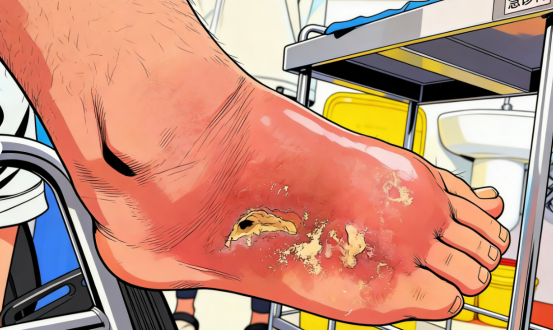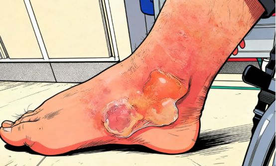 当痛风石逐渐增大,表面皮肤会被撑得变薄、血运变差,日常的摩擦、挤压,甚至像何先生这样的轻微外伤,都可能导致痛风石破溃,而破溃的伤口极难愈合,成为细菌侵入的“门户”,引发严重感染。足部骨筋膜室感染后若诱发骨筋膜室综合征,则会引发肢体缺血坏死的严重后果。